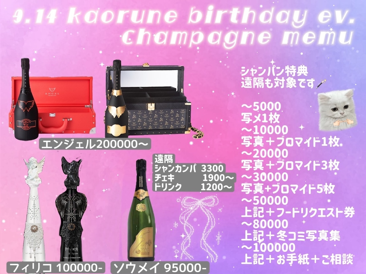 2025年9月14日(日)に行われる「かおるね生誕イベント」のシャンパンのカンパです。シャンパンカンパは達成した額相当のシャンパンを開けさせていただきます。めざせソウメイ!!